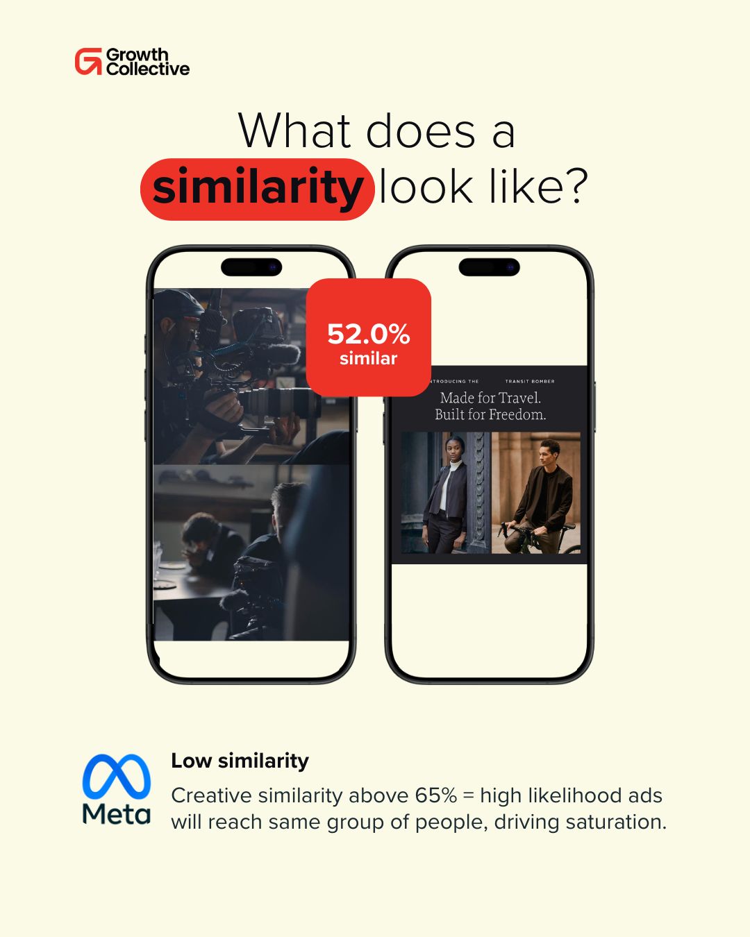 Andromeda evaluates how similar your ad assets are to one another and assigns your account a score. According to Meta, any account with a similarity score above 65% is highly likely to show ads to the same group of people - leading to faster saturation and weaker performance.