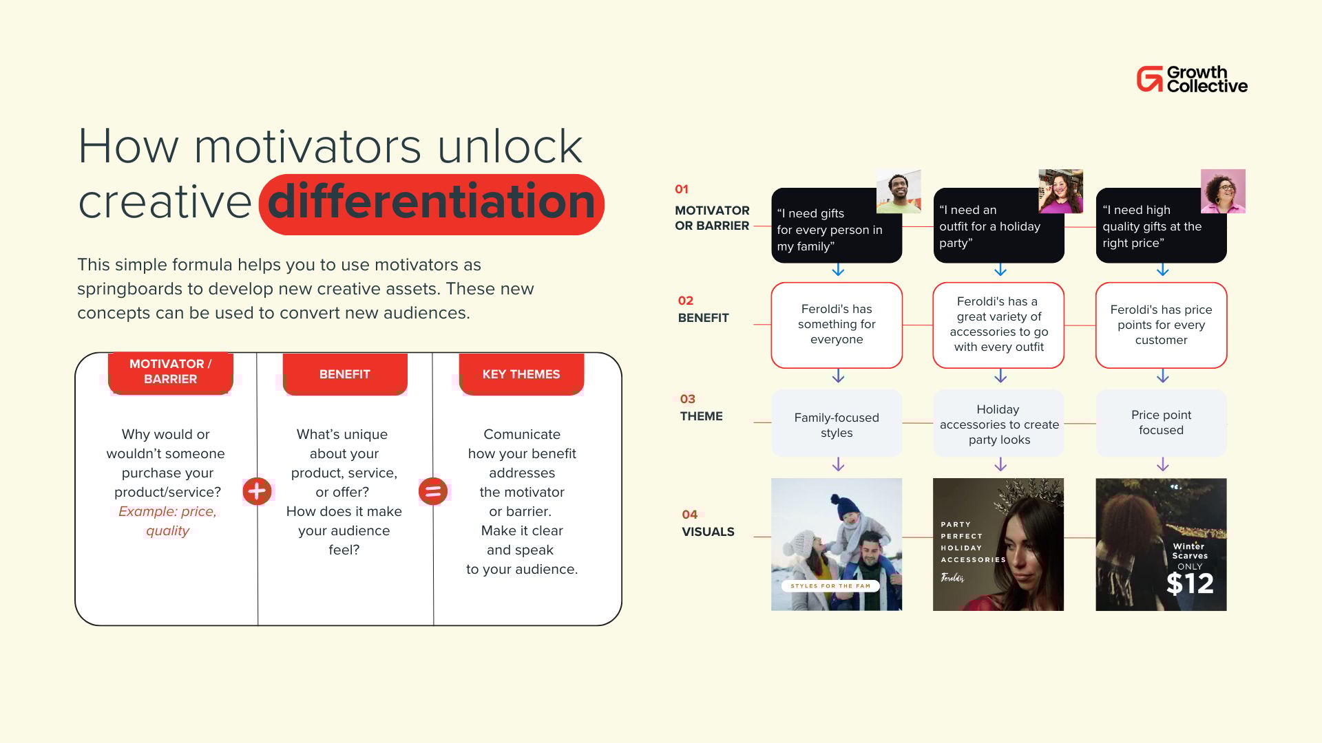 At Growth Collective, we focus heavily on this. Our team uses customer motivators and barriers as a framework to generate new creative angles at scale. By addressing different reasons someone might buy (or hesitate to buy) we’re able to reach entirely new segments without changing targeting at all.