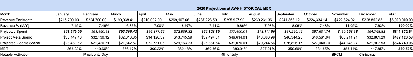 This calendar establishes monthly revenue targets based on the information gathered in Step 1, where we analyzed historical performance patterns. From there, using the insights collected in Step 2, we reverse-engineer the required media investment for each month based on historic MER benchmarks. Finally, we incorporate the findings from Step 3 by adding a buffer informed by key activation periods. Together, this ensures that budget allocations are strategic, intentional, and fully aligned with the growth objectives set for the year.
